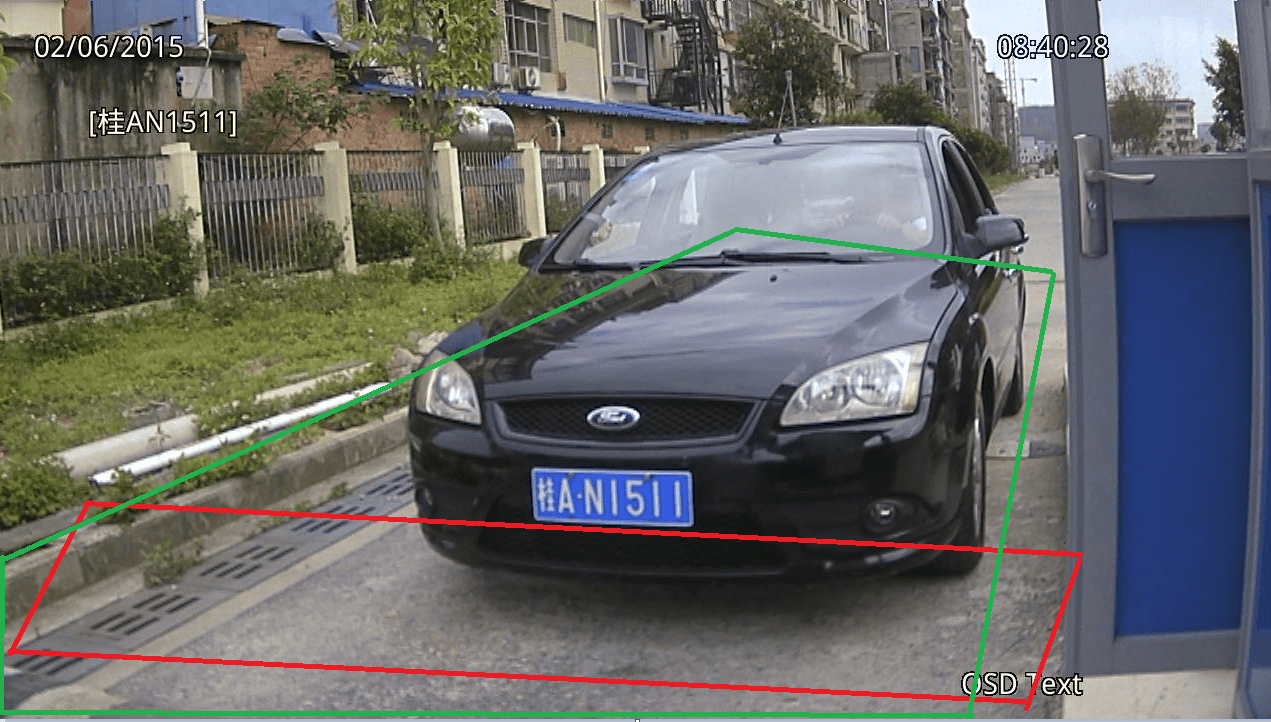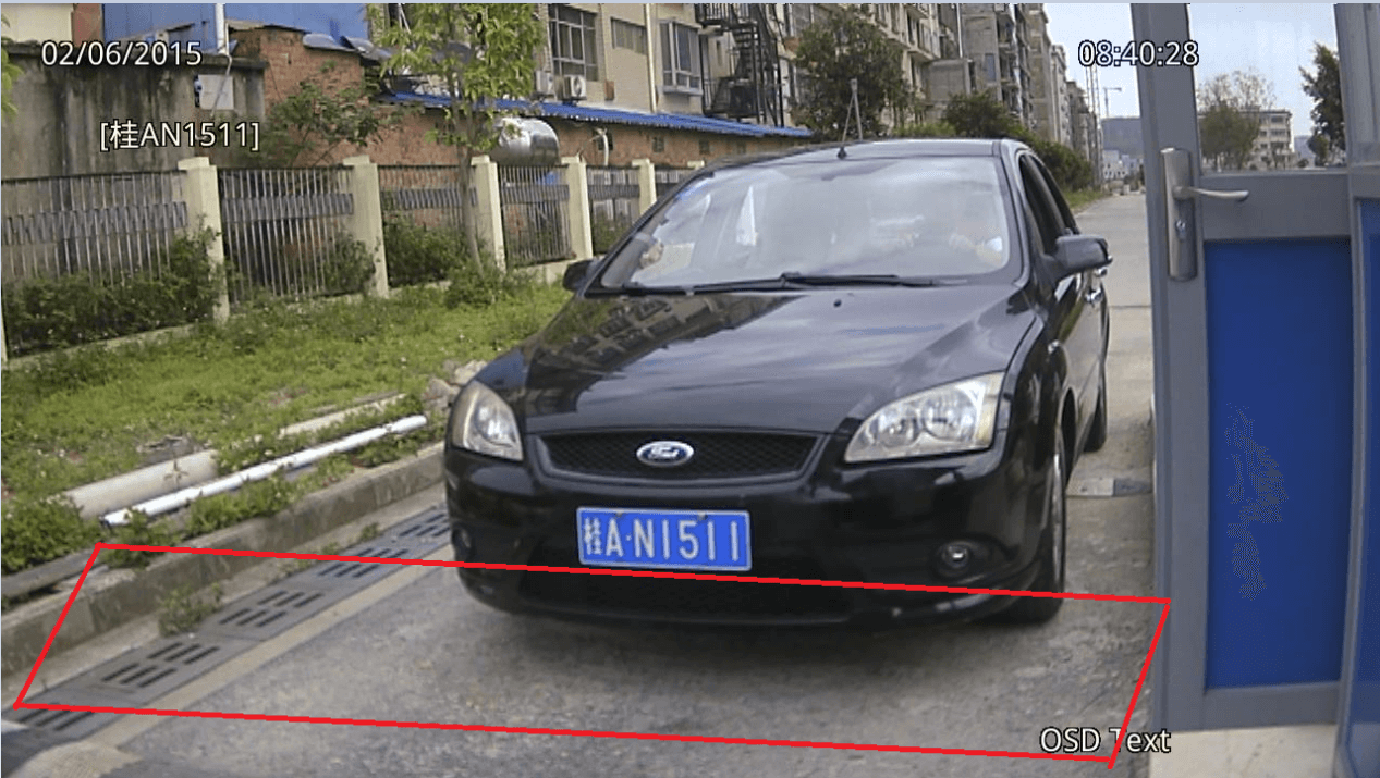 識別區(qū)域要把車牌在畫面上的有效運動范圍都包含進來. 注意:所有現場都必須畫上識別區(qū)域! 如圖:
