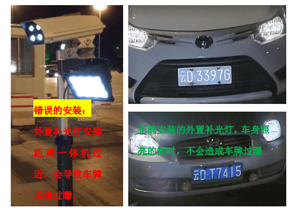 外置補光燈推薦采用白色LED補光燈,20~30W,聚光性質. 安裝高度要和攝像機保持在0.5米~0.7米的距離,外置補光燈的亮斑直接打在車牌或者車牌偏下一點,可以根據車牌過曝情況做微調,比如攝像機離地面高度1.6米,補光燈裝在同一根立柱0.9米~1.1米高; 注意:特別需要避免與以下外置補光燈錯誤的安裝情形: 外置補光燈與攝像機的安裝距離過近,如下圖,兩者的安裝距離小于30cm,補光燈的光線會直接被車牌表面的反光涂層反射到鏡頭,導致車牌在視頻圖像中過曝,顯得發(fā)白,影響 終的識別效果.